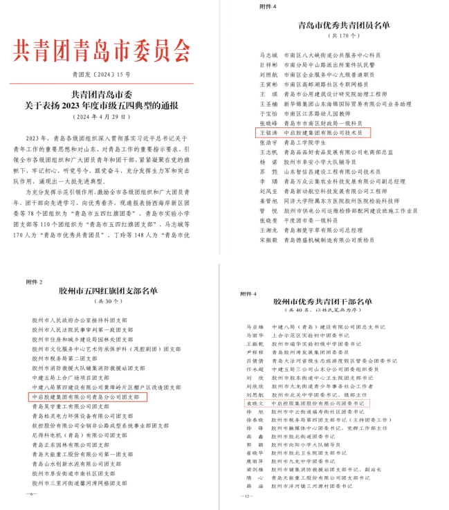 2024年是紀(jì)念五四運(yùn)動(dòng)105周年,也是新中國成立75周年。為傳承和弘揚(yáng)“五四”精神,全面展現(xiàn)上合新區(qū)青年奮發(fā)進(jìn)取的精神風(fēng)貌,膠州團(tuán)市委在膠州市市民文化中心二樓舉行“奮進(jìn)青春力量,建功五大新城”膠州市紀(jì)念五四運(yùn)動(dòng)105周年主題團(tuán)日暨青春故事宣講會活動(dòng),膠州市委副書記劉濤出席并發(fā)表致辭,團(tuán)市委書記孫傳奇帶領(lǐng)全體團(tuán)員、團(tuán)干部重溫入團(tuán)誓詞,會上對全市“五四典型”進(jìn)行通報(bào)表揚(yáng)。中啟膠建集團(tuán)有限公司青島分公司團(tuán)支部榮獲2023年度“膠州市五四紅旗團(tuán)支部”稱號,中啟膠建集團(tuán)膠州分公司團(tuán)員青年職工王銘濤榮獲“青島市優(yōu)秀共青團(tuán)員”稱號,中啟控股集團(tuán)股份有限公司團(tuán)委書記袁曉文榮獲“膠州市優(yōu)秀共青團(tuán)干部”稱號。