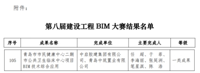 近日,中國(guó)建筑業(yè)協(xié)會(huì)發(fā)文公布了第八屆建設(shè)工程BIM大賽結(jié)果名單,我公司承建的青島市市民健康中心二期市公共衛(wèi)生臨床中心項(xiàng)目榮獲“一類成果”佳績(jī)。