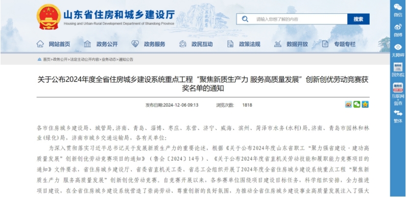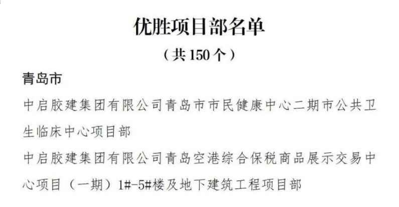 12月6日,山東省住房和城鄉(xiāng)建設(shè)廳官網(wǎng)公布了2024年度全省住房城鄉(xiāng)建設(shè)系統(tǒng)重點(diǎn)工程“聚焦新質(zhì)生產(chǎn)力 服務(wù)高質(zhì)量發(fā)展”創(chuàng)新創(chuàng)優(yōu)勞動(dòng)競(jìng)賽獲獎(jiǎng)名單,中啟膠建集團(tuán)有限公司榮獲“優(yōu)勝集體”稱號(hào),青島市市民健康中心二期市公共衛(wèi)生臨床中心項(xiàng)目部和青島空港綜合保稅商品展示交易中心項(xiàng)目(一期)1#-5#樓及地下建筑工程項(xiàng)目部被評(píng)為“優(yōu)勝項(xiàng)目部”稱號(hào)。