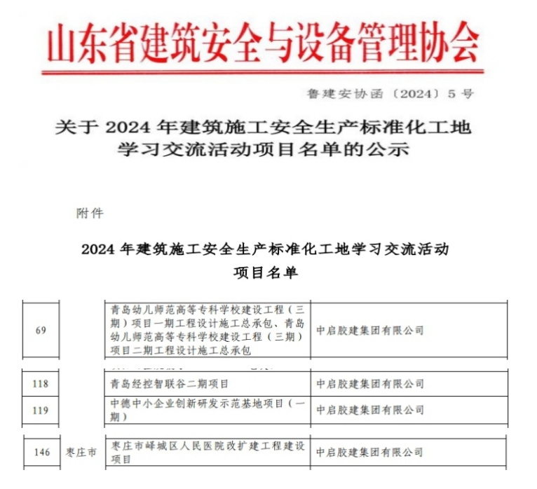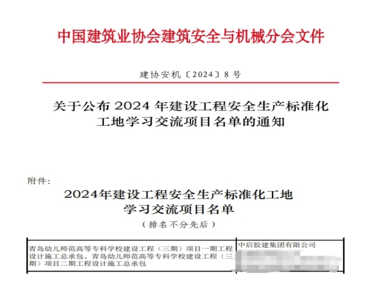 近日,中國建筑業(yè)協(xié)會建筑安全與機械分會和山東省建筑安全與設(shè)備管理協(xié)會公布了“2024年建設(shè)工程安全生產(chǎn)標準化工地學(xué)習(xí)交流項目”名單,公司承建的青島幼兒師范高等??茖W(xué)校建設(shè)工程、青島經(jīng)控智聯(lián)谷二期項目、中德中小企業(yè)創(chuàng)新研發(fā)示范基地項目、棗莊市嶧城區(qū)人民醫(yī)院改擴建工程建設(shè)項目獲得山東省建筑施工安全生產(chǎn)標準化工地學(xué)習(xí)交流活動項目。其中,青島幼兒師范高等??茖W(xué)校建設(shè)工程獲得全國建設(shè)工程安全生產(chǎn)標準化工地學(xué)習(xí)交流項目。