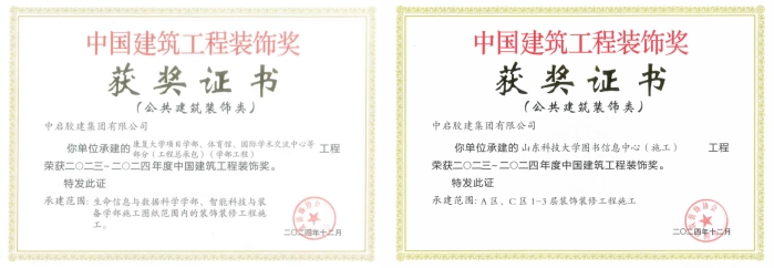 大會發(fā)布了2023年度中國建筑裝飾協(xié)會行業(yè)綜合數(shù)據(jù)統(tǒng)計報告,并頒發(fā)了2023-2024年度第一批中國建筑工程裝飾獎。中啟膠建集團建筑七公司承建的康復大學項目學部、體育館、國際學術(shù)交流中心等部分(工程總承包)(學部工程);建筑九公司承建的山東科技大學圖書信息中心(施工)兩個項目入選。