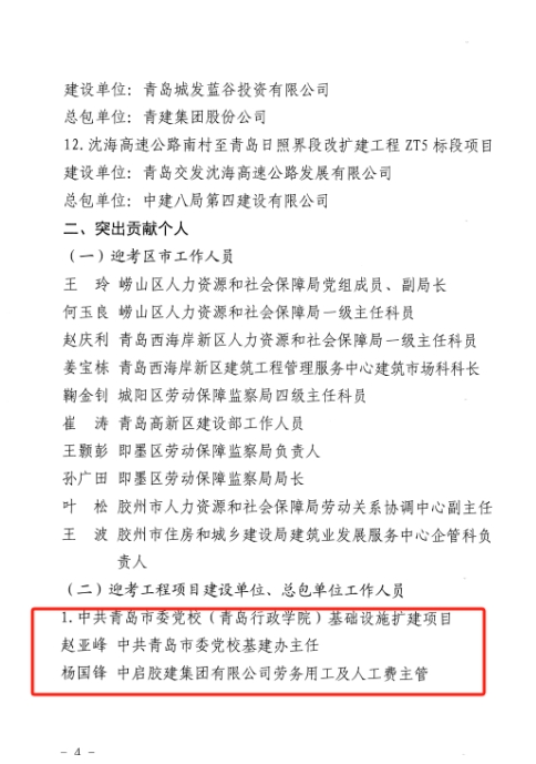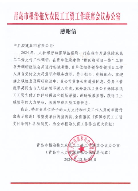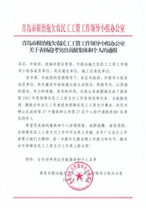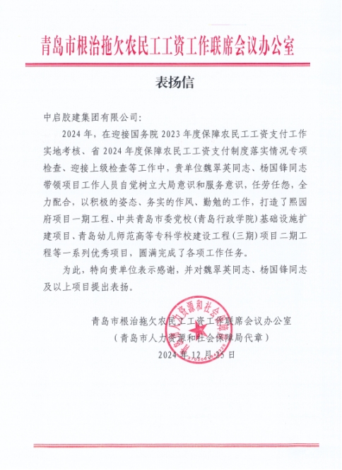 2024年,在公司領(lǐng)導(dǎo)的正確帶領(lǐng)下,在各單位各項目的大力支持和相關(guān)工作人員辛勤付出下,公司在保障農(nóng)民工工資支付工作方面先后圓滿完成了各項調(diào)研、檢查工作并取得了優(yōu)異成績。為表彰我公司在保障農(nóng)民工工資支付工作方面做出的突出貢獻(xiàn),青島市人社局、膠州市人社局分別向公司發(fā)來感謝信,對公司及在調(diào)研、檢查工作中做出突出貢獻(xiàn)的先進(jìn)項目和先進(jìn)個人魏翠英、楊國鋒進(jìn)行通報表揚。
