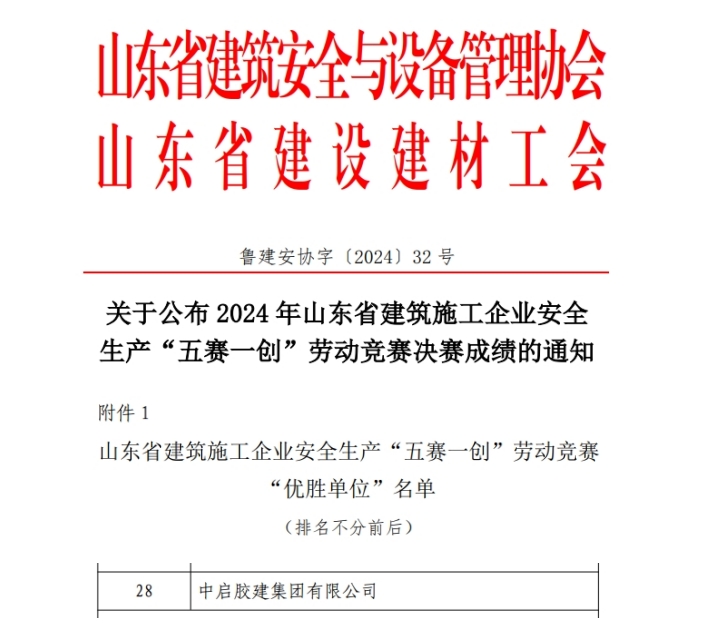 近日,2024年山東省建筑施工企業(yè)安全生產(chǎn)“五賽一創(chuàng)”勞動(dòng)競(jìng)賽活動(dòng)圓滿落幕。其中,中啟膠建集團(tuán)有限公司被評(píng)選為山東省建筑施工企業(yè)安全生產(chǎn)“五賽一創(chuàng)”勞動(dòng)競(jìng)賽“優(yōu)勝單位”,公司承建的青島空港綜合保稅商品展示交易中心項(xiàng)目被評(píng)為“優(yōu)勝班組”,膠州公司劉文基被評(píng)選為“優(yōu)勝個(gè)人”。