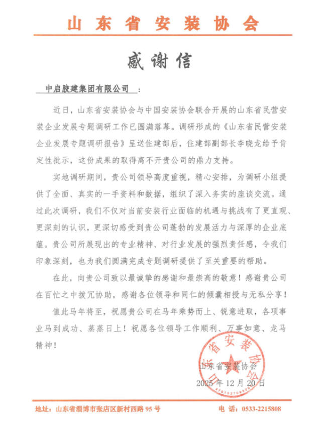協(xié)會(huì)在信中特別提及,深切感受到中啟膠建集團(tuán)有限公司蓬勃的發(fā)展活力與深厚的企業(yè)底蘊(yùn),并祝愿集團(tuán)各項(xiàng)事業(yè)蒸蒸日上。此次獲贊既是行業(yè)對(duì)集團(tuán)實(shí)力的認(rèn)可,更是對(duì)全體員工的激勵(lì),讓我們攜手奮進(jìn),再創(chuàng)佳績!